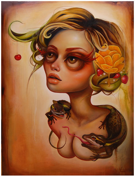 Tatiana Suarez (b. 1983) is a Brooklyn-based Miami native. This emerging artist is an alumni of the University of Miami’s Graphic Design program, and also works as a freelance illustrator. Her charming style is distinctive — first, the trademark eyes that draw the viewer into a beautiful and surreal world. Suarez takes full advantage of the oil paint’s ability to create creamy, soft images on canvas. Rich with symbols that stem from her Brazilian and El Salvadorian heritage, subjects appear as if they are under water, frozen in lovely stillness. The doe-eyed figures look childlike, but also exude sexual overtones, ornamented with plants, insects and other unsettling accompaniments. Beauty is presented concurrently with exotic — even creepy — creatures to create enchanted narratives.